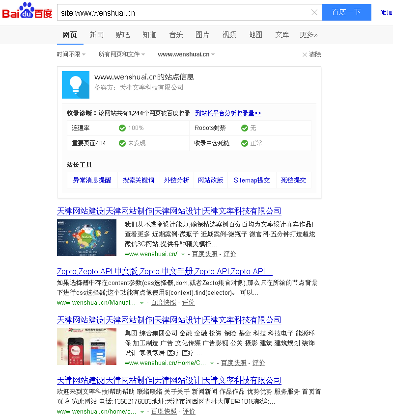 2.百度收錄:在百度里面通過指令site:就可以查詢到。通過收錄,我們可以分析出一系列的問題,如site:m.308p.com 見下圖我們可以看到文率科技的首頁在⑴位,如果不在⑴位或者收錄降了很多說明網(wǎng)站被降權(quán)了,這樣我們就可以通過收錄的數(shù)據(jù),對比同等級下的兩個頁面(一個收錄了一個未收錄),找出頁面未收錄的原因,從而改進。