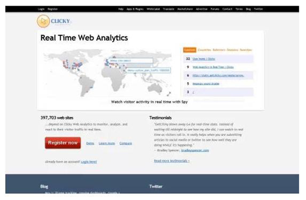 Woopra的出現(xiàn)將實(shí)時(shí)統(tǒng)計(jì)帶到了另一個(gè)層次,它能實(shí)時(shí)直播網(wǎng)站的訪問(wèn)數(shù)據(jù),你甚至可以使用Woopra Chat部件與用戶(hù)聊天。不僅如此,另外,Woopra還擁有先進(jìn)的通知功能,可讓你建立各類(lèi)通知,如:電子郵件、聲音、彈出框等。