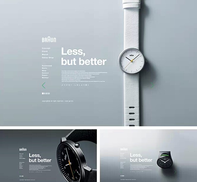 例如:“獸人必須死”首發(fā)引導(dǎo)頁面,周圍大面積留白,并結(jié)合簡(jiǎn)潔的排版,讓頁面模塊之間區(qū)分明顯,視覺集中,很好的給用戶引導(dǎo),給人一種精致和輕松感。例如:BRAUN博朗,整個(gè)頁面,簡(jiǎn)潔的圖片與文字的排版,讓視線非常集中,這樣用戶快速的將注意力集中到內(nèi)容上去,非常符合他們的主題“Less,but better”,給人留下回味、想象的空間。