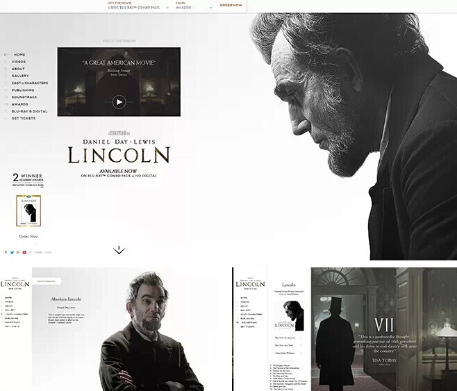 例如:LINCOLN電影網(wǎng)站,運(yùn)用最常用的黑白兩種顏色搭配,讓網(wǎng)頁如此簡(jiǎn)約大方,給人留下無限想象空間。