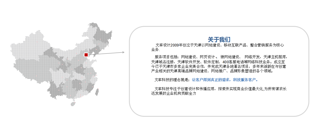 文率科技的服務(wù)項目包括:天津網(wǎng)站建設(shè)、微網(wǎng)站建設(shè)、天津網(wǎng)站設(shè)計,網(wǎng)絡(luò)開發(fā),天津主機租用,天津域名注冊,天津軟件開發(fā)、軟件定制、400客服電話等網(wǎng)絡(luò)科技業(yè)務(wù)。成立至今已于天津市多家企業(yè)完美合作,并完成天津各地著名項目,多年來活躍在與創(chuàng)意產(chǎn)業(yè)相關(guān)的天津高端品牌網(wǎng)站建設(shè)、網(wǎng)站推廣、品牌形象塑造的各個領(lǐng)域。