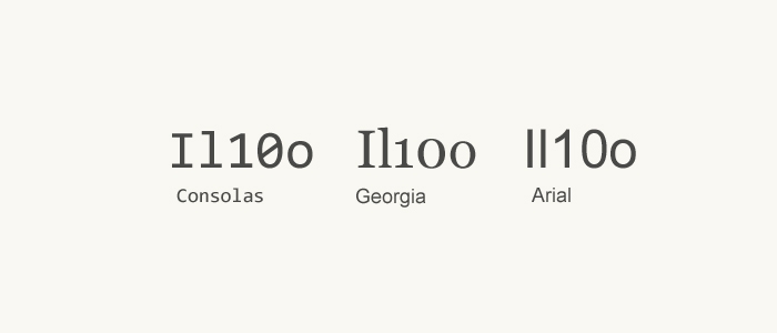 在Arial字體中,i,l 的辨識度很低,而且當有連續(xù)的il等較窄文字出現時,文字難以選中。此外Georgia中,字母o,與數字0 只在大小上略有區(qū)別,基本上分不清,很難做到一目了然。由此可見,等寬字體受字母本身的干擾較小,字母大小固定,密度固定,此類字體,簡單容易辨認,大大提升了閱讀效率。