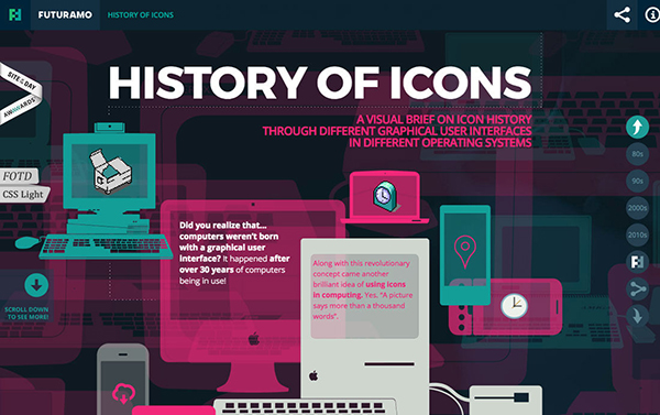 圖標(biāo)設(shè)計需要契合整個設(shè)計策略,仔細(xì)審視你所需要設(shè)計的內(nèi)容和風(fēng)格,再將圖標(biāo)和流行的元素結(jié)合起來,營造出符合現(xiàn)代風(fēng)格的美學(xué)特征。另外,圖標(biāo)最大的特性就是它具有靈活性,它從形狀到細(xì)節(jié)都可以充滿藝術(shù)性,從手繪風(fēng)到扁平化,從精致擬物到藝術(shù)化處理都很容易實現(xiàn)。而上面這個關(guān)于圖標(biāo)歷史的網(wǎng)站就展示了多年來圖標(biāo)風(fēng)格的演變,這些圖標(biāo)所呈現(xiàn)出來的風(fēng)格、色彩、使用方法和規(guī)格都非常值得設(shè)計師們研究學(xué)習(xí)。